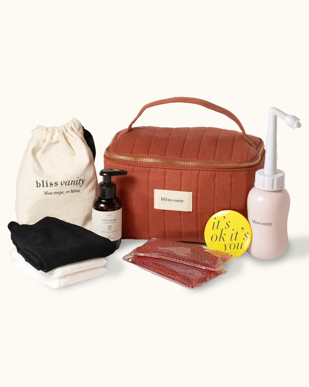 Ce kit post-partum à glisser dans la valise de maternité contient les soins et accessoires essentiels pour prendre soin de son corps après l'accouchement.