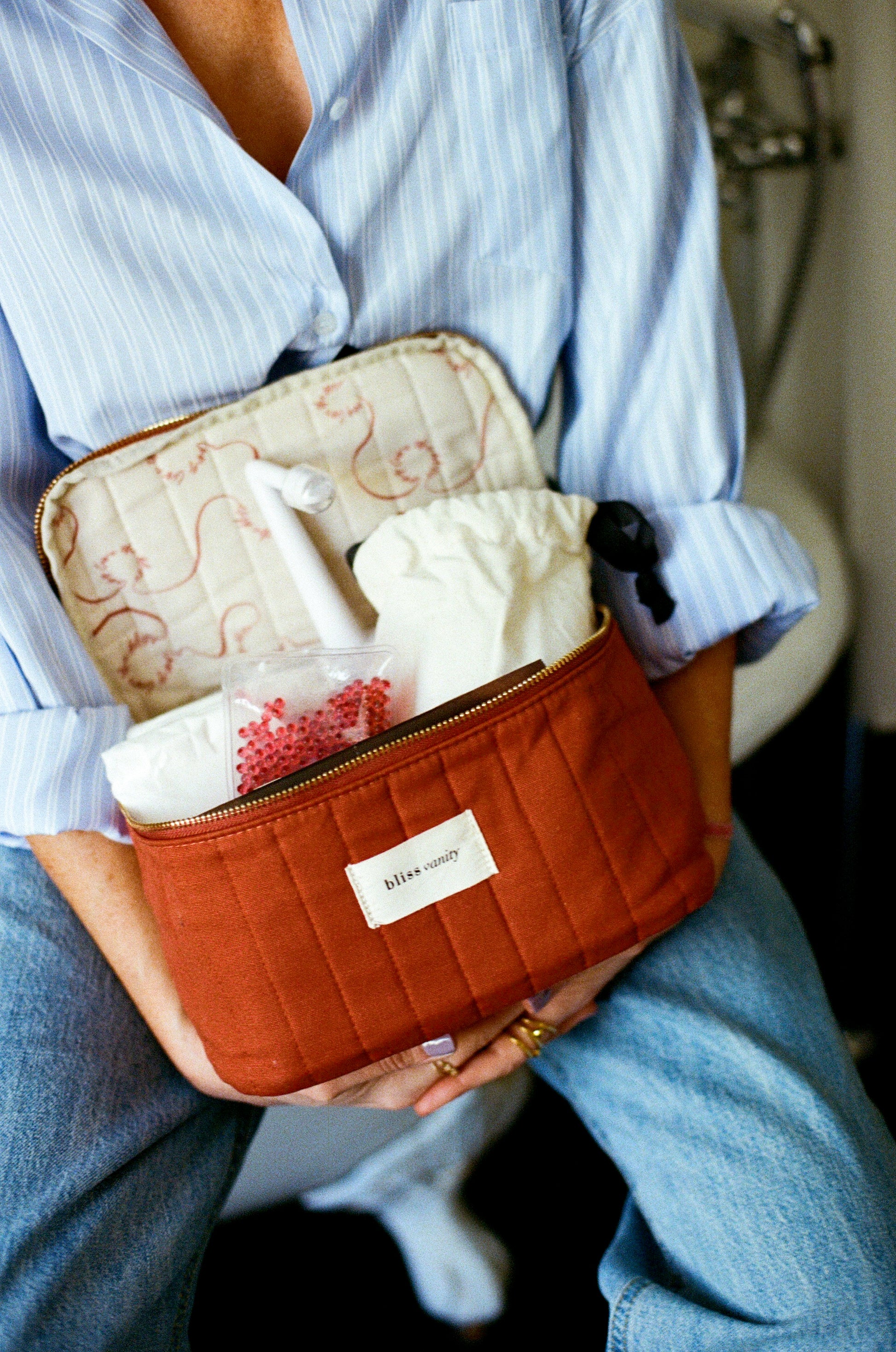 Dedans, il y a de quoi changer la donne du post-partum avec les produits essentiels pour prendre soin du corps de la femme, dès les premières heures qui suivent l’accouchement. Et parce que cette trousse de sauvetage est précieuse, on voulait que tout ce qu’elle contient soit beau et bien pensé. Avec le Bliss Vanity, tu es équipée comme jamais pour savourer ta nouvelle vie !